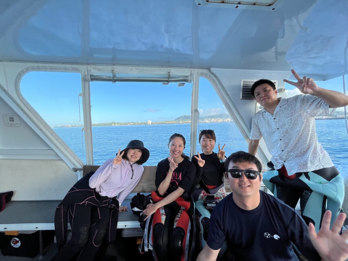 ダイビングの合間や夜は、スタッフおすすめの島グルメを堪能。ログ付けをしながら、仲間と一緒に石垣島の風を感じるひとときは、日常を忘れさせてくれます。